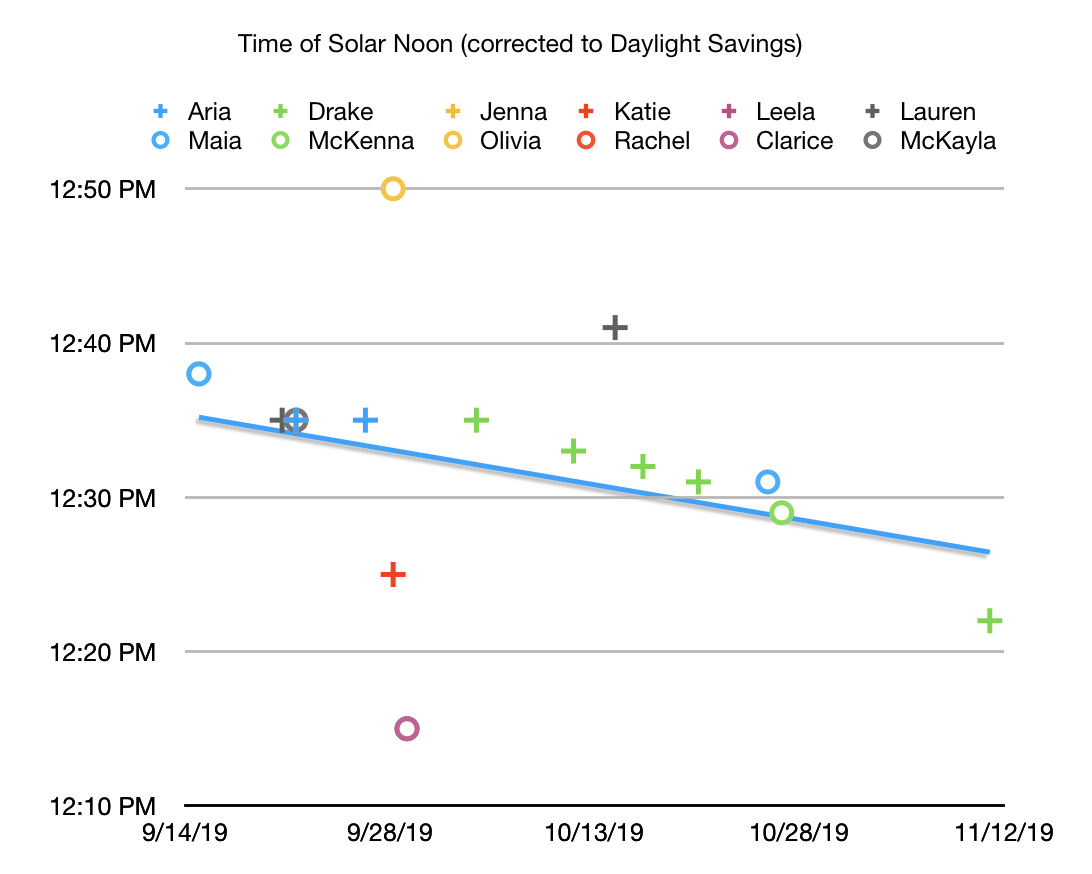 Compass measurements for the direction of the sun’s shadow were all over the map. They should be clustered around 14˚, but ours were as much as 90˚ off, essentially at a right angle to the correct answer. Given this range of error, I didn’t bother drawing a trend line: