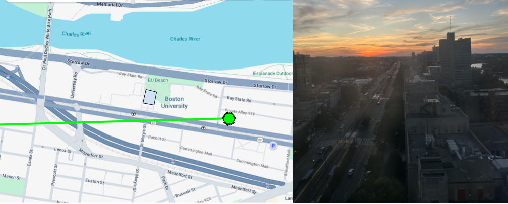 I’m confident in my findings as the direction of the sunset is west and it was marked on the map. The landmark referenced in the map is Warren Towers. I was in my friend’s room around sunset a lot last year, so I was very confident that I was facing the correct direction for sunset. Landmarks include the BU Bridge, the Photonics building, and the StuVi buildings