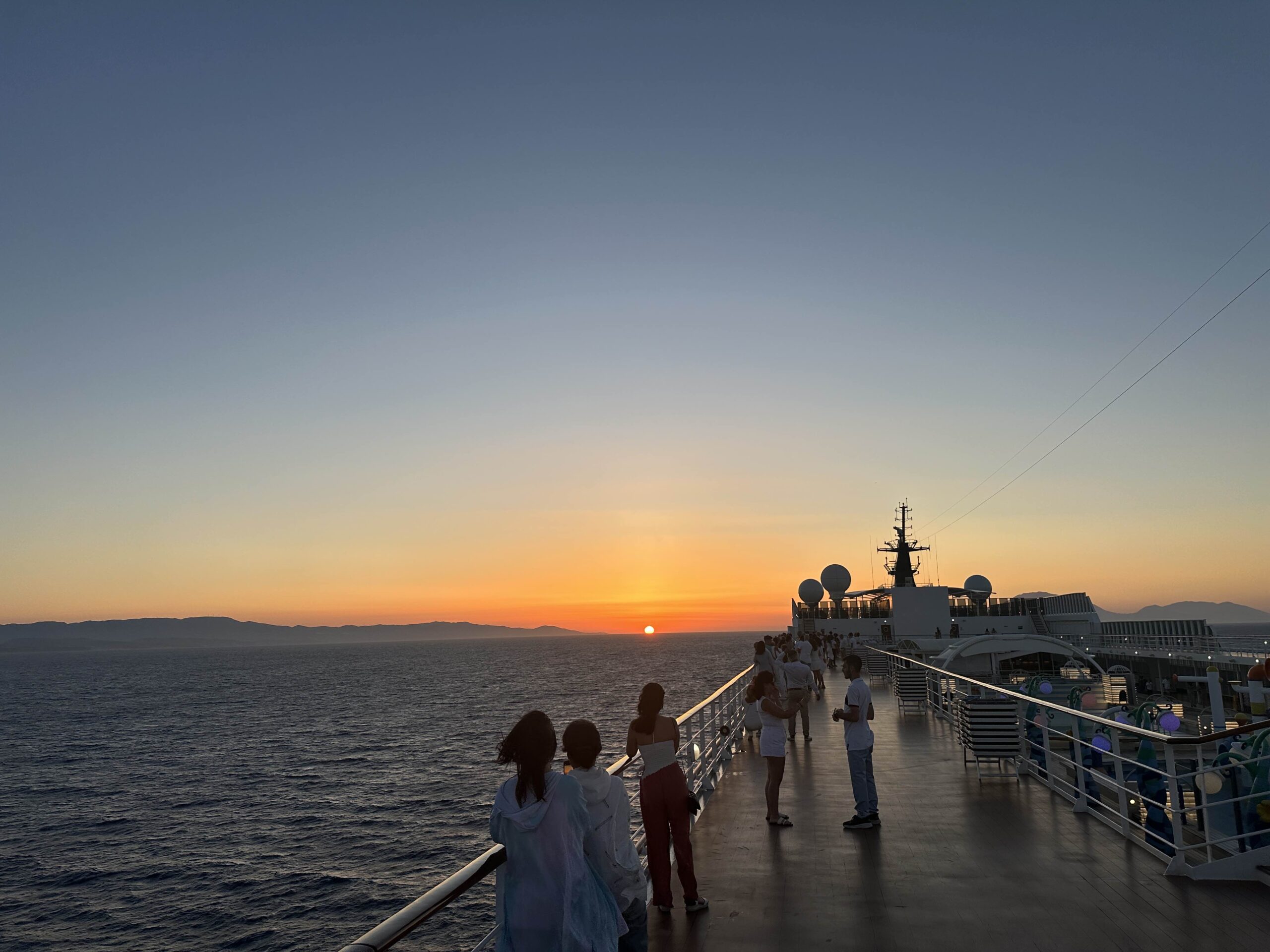 I am pretty confident in my findings. I took this photo on July 23rd, 2025, in Greece. This would further support the fact that the sun would be setting in the south-western direction. I attempted to line up the sunset with the island visible in the photo, which I found out is likely Zakinthos.