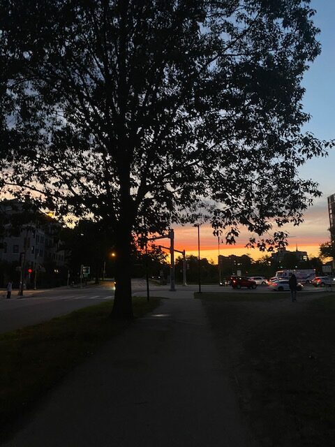 I took this picture on Brighton Ave by the Packard’s Corner Green Line stop around 6:45. It was hard finding enough open space on the sidewalk to take the picture as there were trees blocking the way even though the street was wide open. Brighton Ave faces slightly northwest so the sun set on the left side of the picture. Due to time issues I wasn’t able to find a less obstructed view.