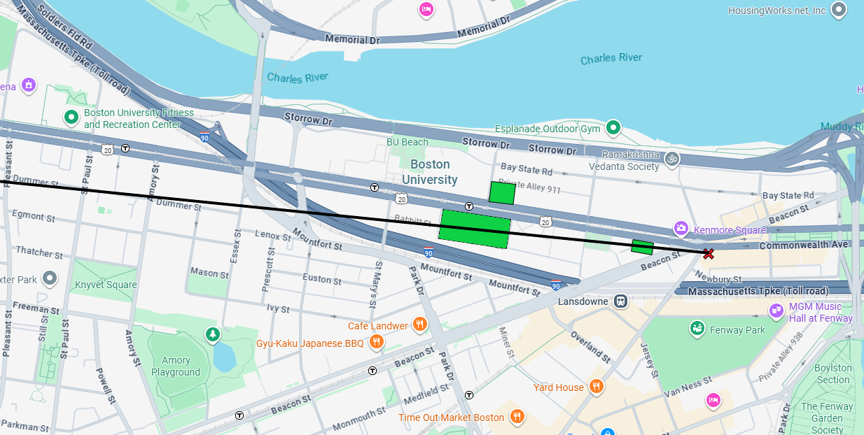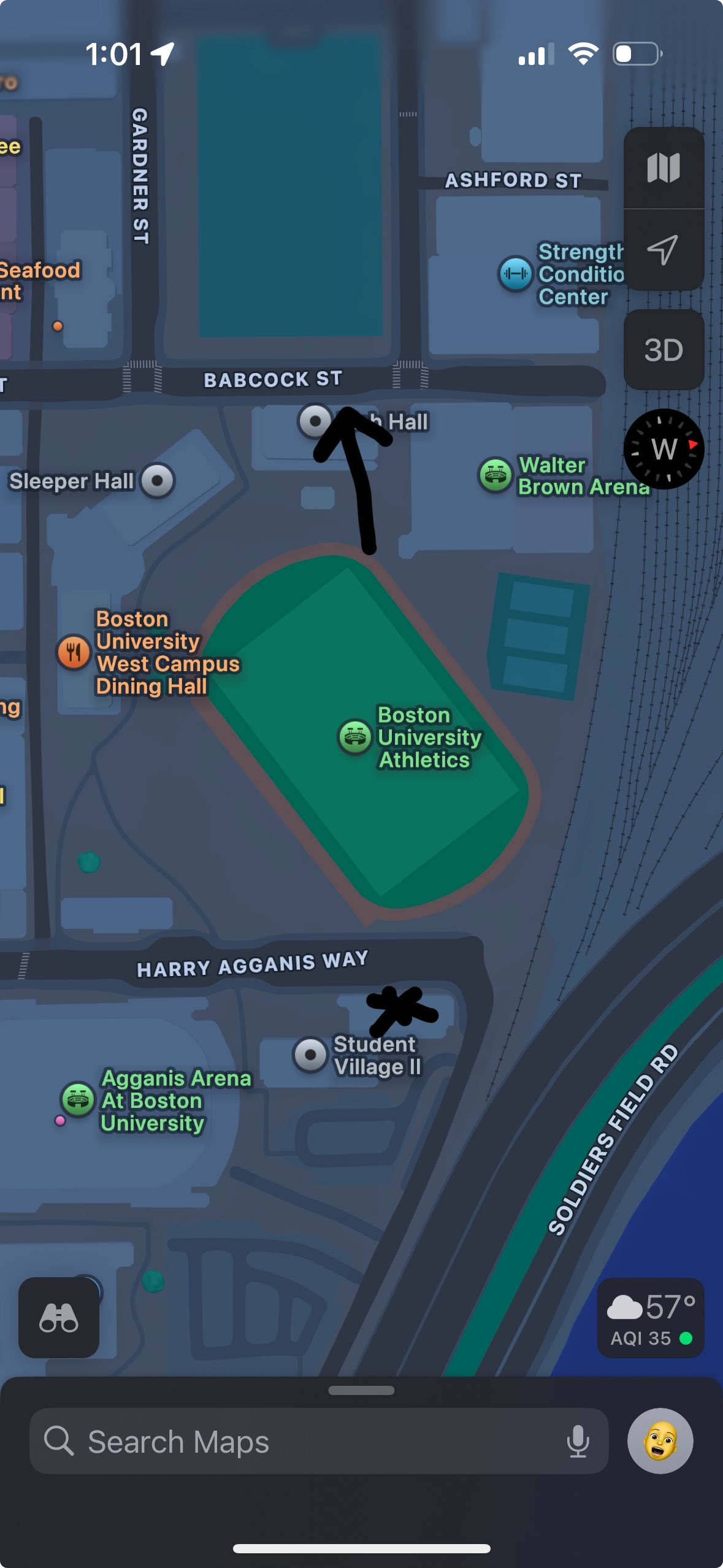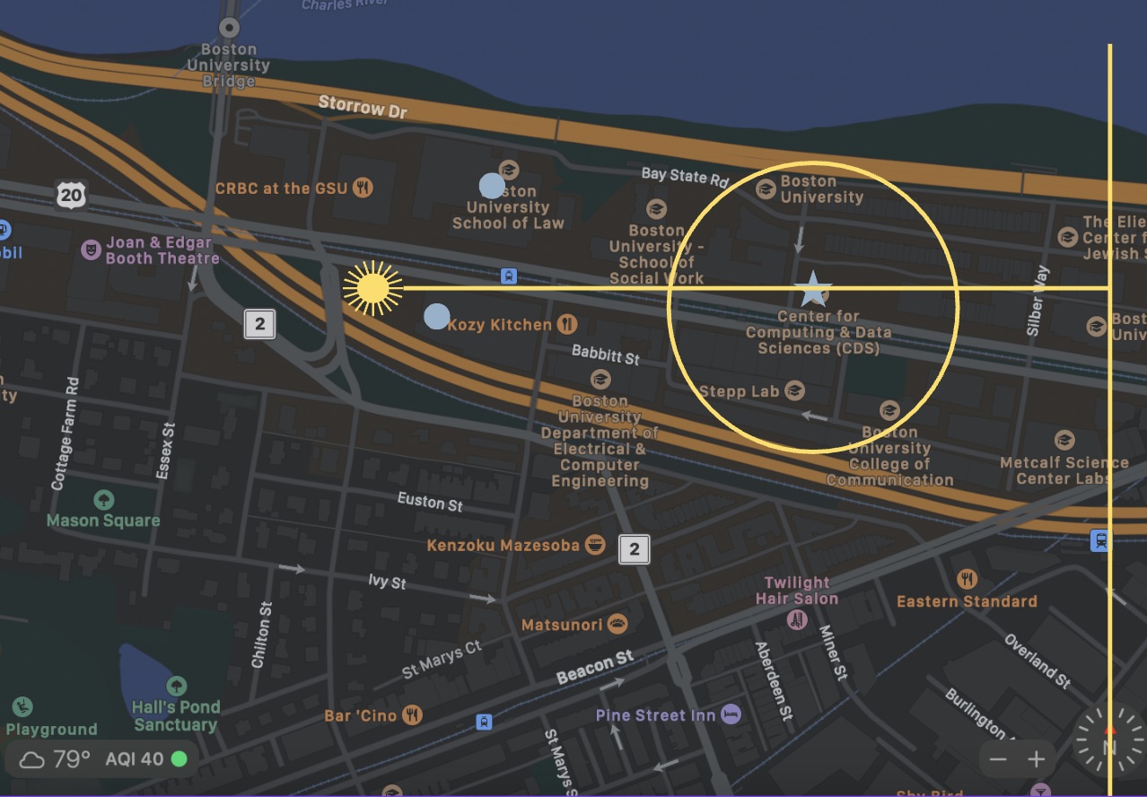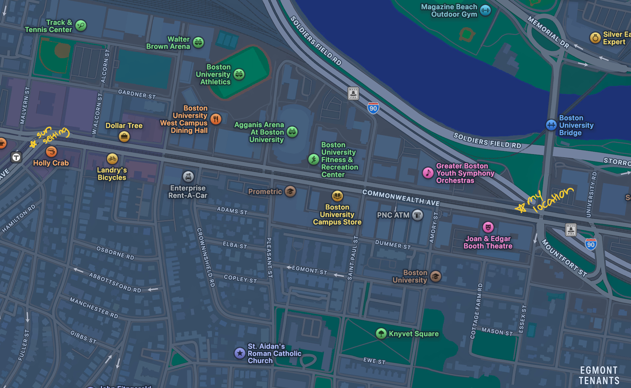 I am confident that I correctly marked the position of the setting sun and my own location. If I am on Comm Ave, I know that the sun sets in the west, so I would need to look towards the direction of West Campus. Landmarks on West Campus include Stuvi 1 & 2 and Agganis Arena. My location is on the south end of the BU bridge, which I know because the Charles River is north of BU’s campus. I also know that the Green Line B branch runs west to east and vice versa so I can also orient myself with the T. Using all of these landmarks can help improve and confirm the direction of the setting sun.