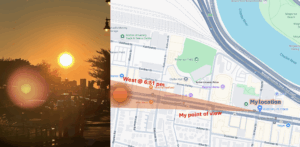 I feel fairly confident in these findings because the train tracks provided a clear directional guide. Since the tracks themselves run west, and the sun was setting directly in front of me along them. However, the horizon line was not completely clear and the sun was not completely visible due to the horizon line being blocked by several buildings, since I took this photo on ground level. To make my mapping even more accurate, I need to find a way to gain elevation to gather ideal images as well as write down nearby landmarks to cross-check my exact position and confirm the perspective of the shot. These extra details would significantly improve my findings