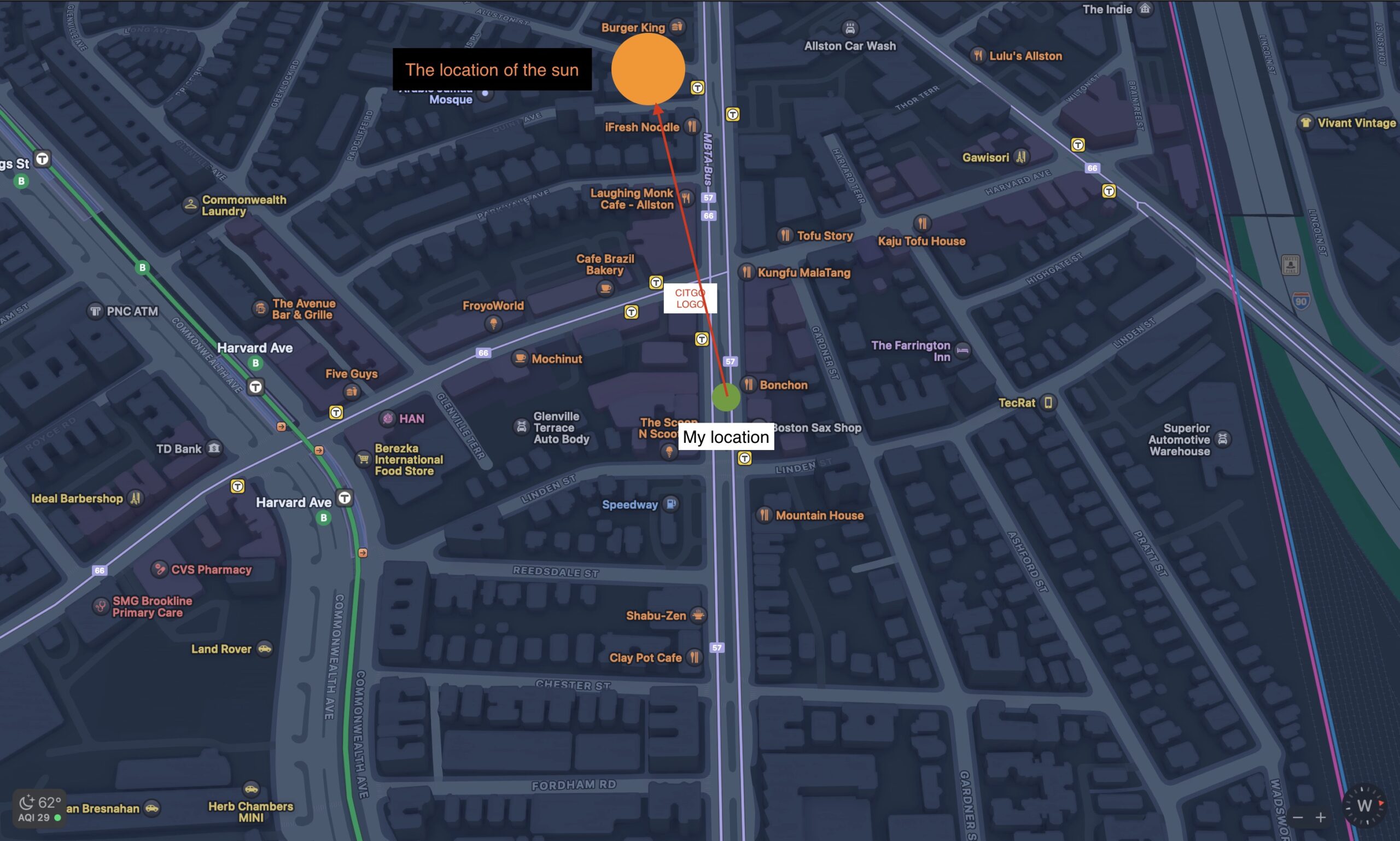 Even though I couldn’t capture a good picture of the sunset I still watched the sun drop so I could kind of guess the direction of the sun. Actually I used the building it dropped behind as the main landmark which turned out to be fairly useful. By checking on google maps and drawing a line from my direction to the building that the sun dropped behind, I could get a general direction of the sunset. The map shows that the sunset mostly to the west and slightly to the north and this makes sense because we should expect the sun to be perfectly west during the equinox which is coming soon. One way to improve landmarks used is to find landmarks further away because this means the line between me and the landmark could be longer which would result in a more accurate angle of the sun. Surprisingly even though I couldn’t see the sunset directly, I felt like this was still pretty accurate because I could catch where the sun was falling.